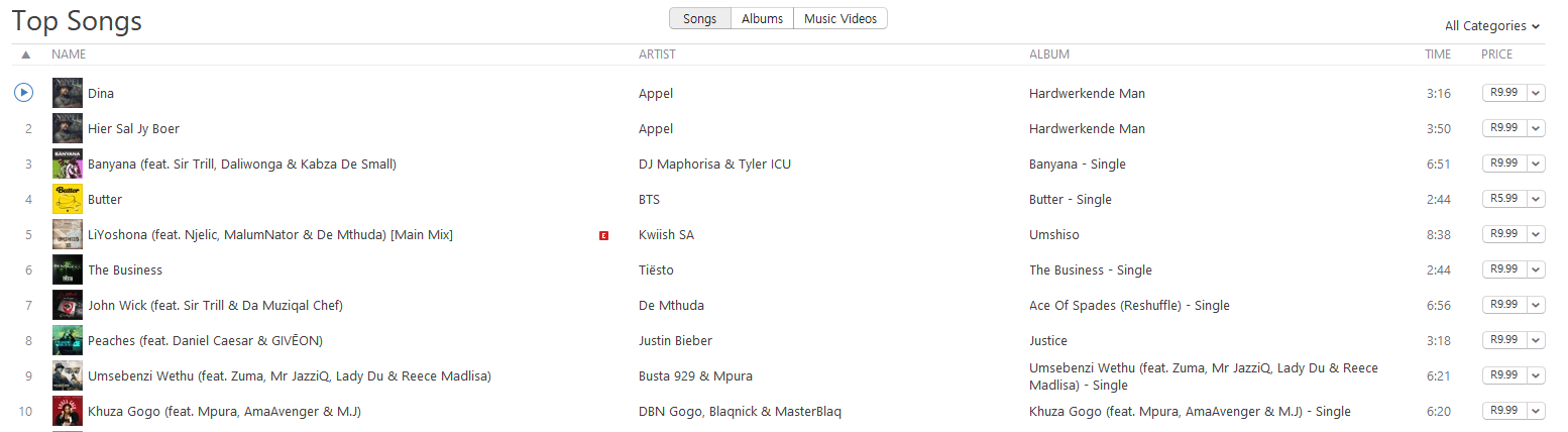 Hierdie prestasie gebeur so selde vir ‘n Afrikaanse liedjie, van die vorige kere wat dit al gebeur het was Dames van Biggy wat op 3 September 2019, No 1 bereik het. Ricus Nel en Snotkop het met Boerepompie ook No 1 gegaan op 14 Junie 2019 en Karen Zoid het dit ‘n ongelooflike sewe keer reggekry met haar Republiek van Zoid Afrika enkelsnitte.