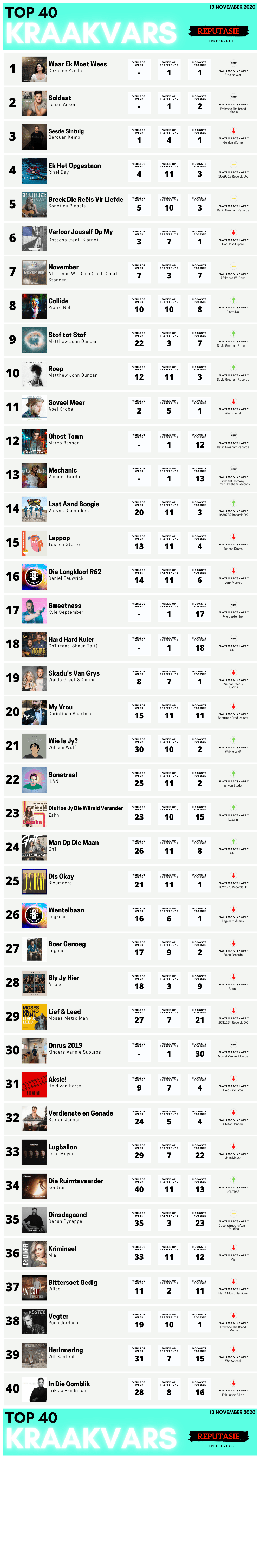 Johan Anker se Soldaat maak sy debuut op No 2. Gerduan Kemp skuif 2 posisie af na No 3 nadat die snit twee weke op No 1 gespandeer het. Rinel Day en Sonet Du Plessis hou vas aan hul posisies die week, onderskeidelik met Ek Het Opgestaan op No 4 en Breek Die Reëls Vir Liefde op No 5.