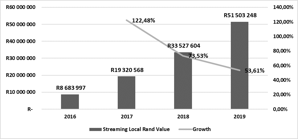Die groei van inkomste in 2019 kan toegeken word die groei van stroomdienste in Suid-Afrika, soos gewys in die figuur hieronder. stroomdienste het slegs R8.6 miljoen bygedra tot inkomste in 2016, in 2019 het dit tot R62.7 miljoen gestyg. Stroomdienste het die industrie gered, maar stroomdienste bevoordeel die groot kunstenaars ten koste van die klein kunstenaars.
