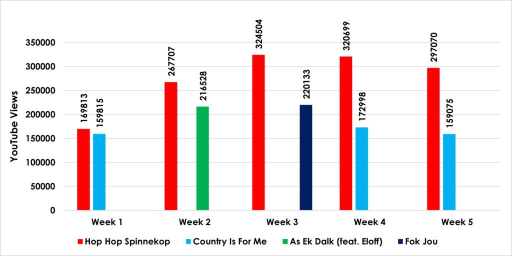 “Hop Hop Spinnekop” se YouTube views vir die afgelope 5 weke wys dat die liedjie verreweg die meeste views per week kry, maar het ook hoogtepunt bereik in Week 3 met meer as 324 000 views.