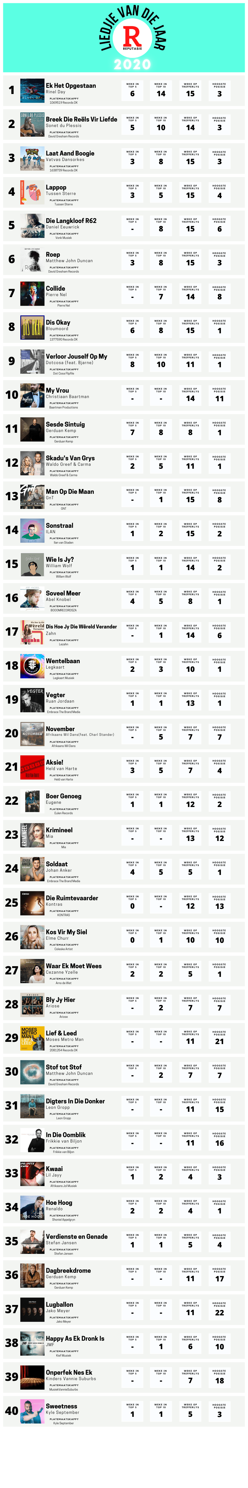 Sien die volledige Liedjie van die Jaar 2020 trefferlys hieronder: