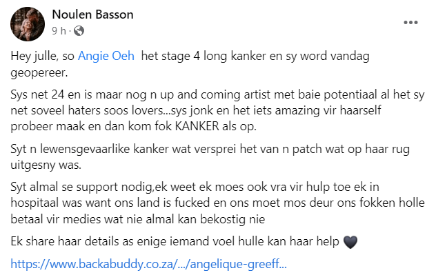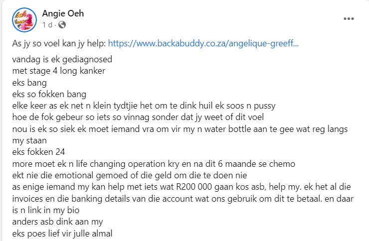 In ‘n roerende en persoonlike boodskap van moed en kwesbaarheid het Angie Oeh gister die nuus van haar diagnose met stadium 4 longkanker op haar Facebook-blad gedeel. Haar openhartige woorde het ‘n golf van simpatie en ondersteuning ontlok terwyl sy haar onsekerheid, vrees en emosionele pyn met die wêreld gedeel het.