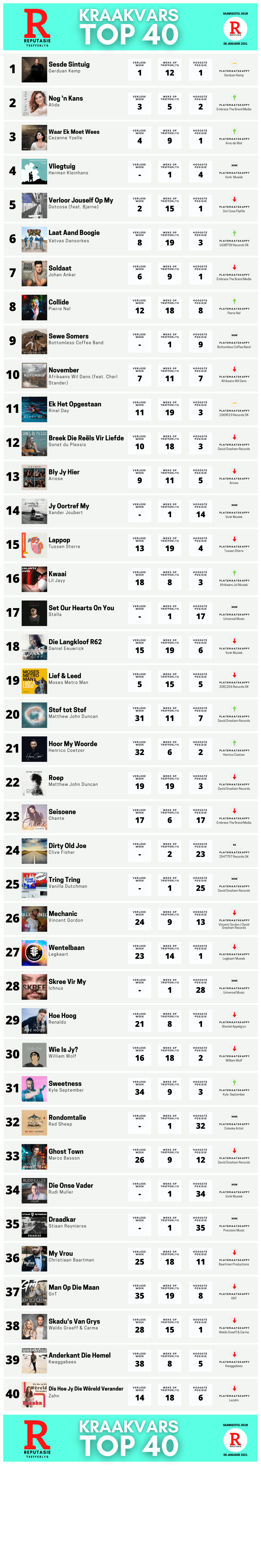 Die eerste nuweling op die trefferlys is Vliegtuig van Herman Kleinhans was sy debuut op No 4 maak. Verloor Jouself Op My van Dotcosa (feat. Bjarne) sak terug vanaf No 2 verlede week na No 5. Laat Aand Boogie van Vatvas Dansorkes klim twee range na No 6 die week. Johan Anker se Soldaat sak terug na No 7. Pierre Nel is terug op sy hoogste posisie op No 8, na die snit verlede week op No 12 was. Dit is ook die liedjie se 18de week op die trefferlys.