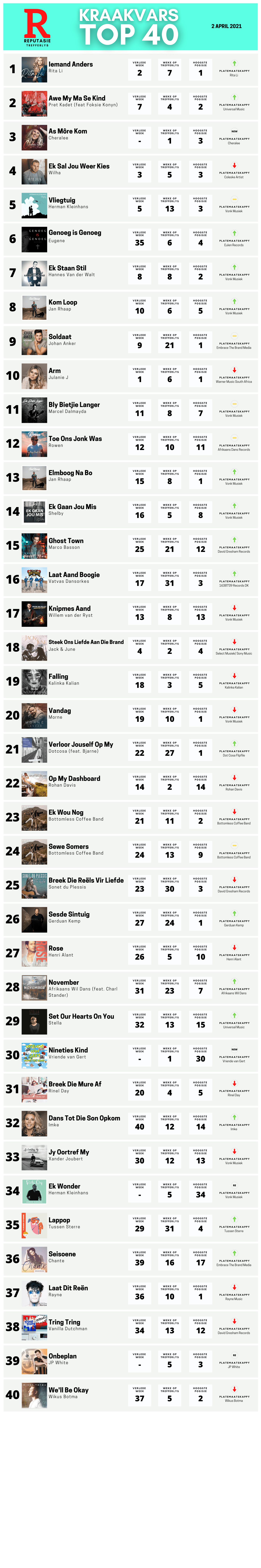 Hoe gaan die gesegde? Eerder laat as nooit. Hierdie week op die Kraakvars Top 40: