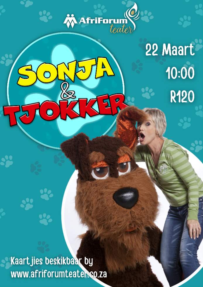 Sonja Herholdt en haar beste hondjiepêl, Tjokker, besoek AfriForum Teater op 22 Maart 2024 met ’n lekker, prettige kinderteaterproduksie.