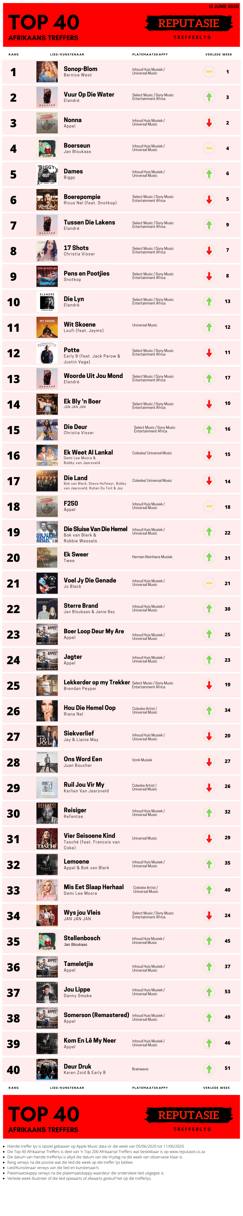 Die week op die Reputasie Top 40 Afrikaanse Trefferlys – 12 Junie 2020