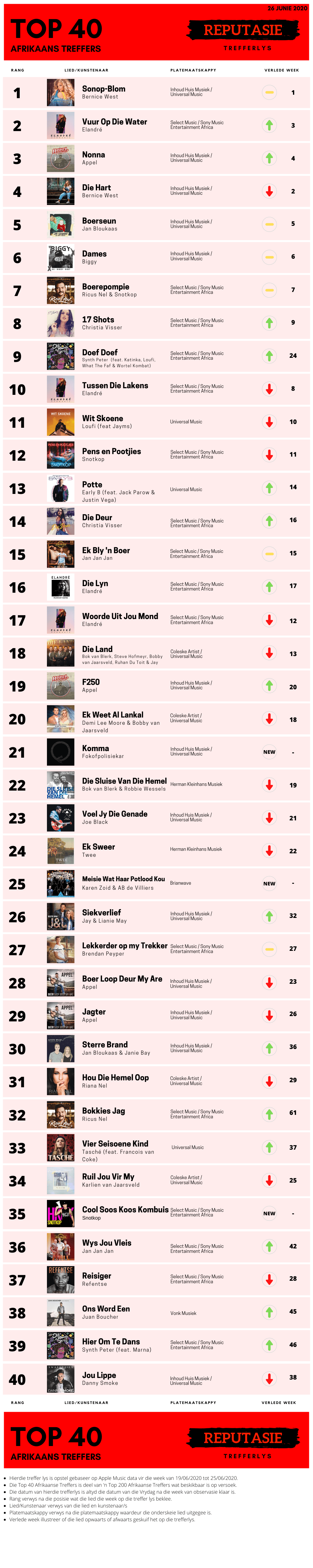 Die week op die Reputasie Top 40 Afrikaanse Trefferlys – 26 Junie 2020