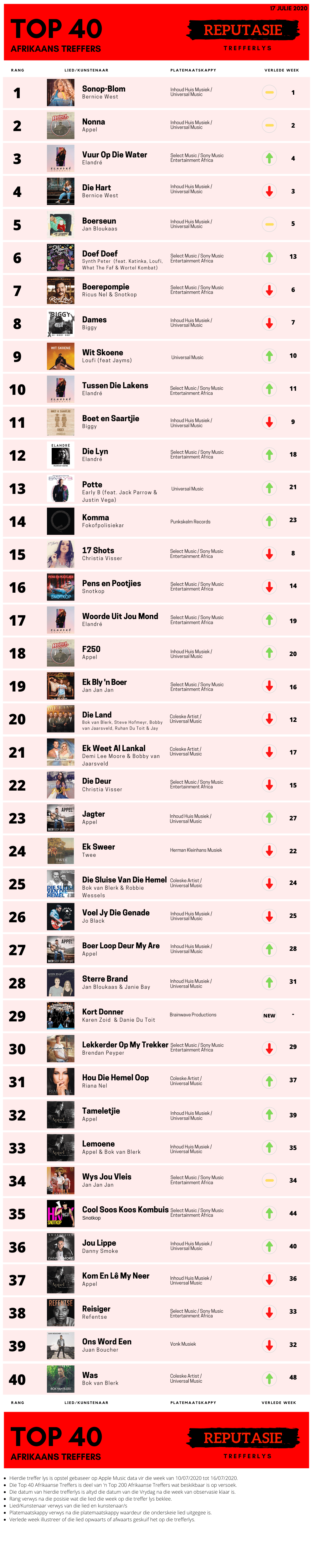 Hierdie week op die Reputasie Top 40 Afrikaanse Trefferlys – 17 Julie 2020