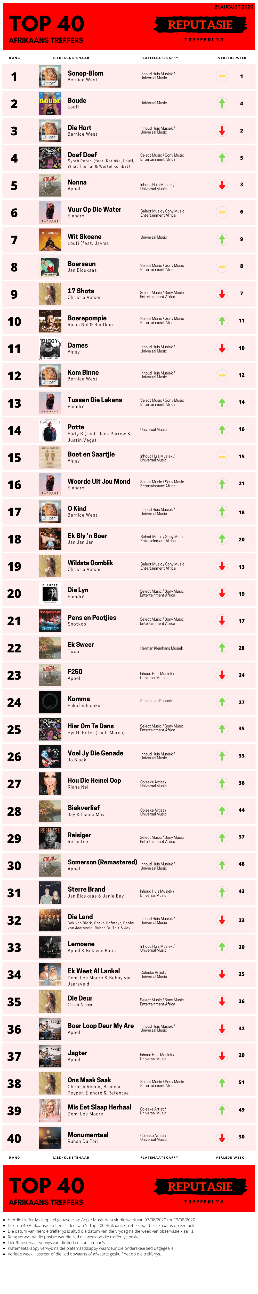 Hierdie week op die Reputasie Top 40 Afrikaanse Trefferlys – 21 Augustus 2020