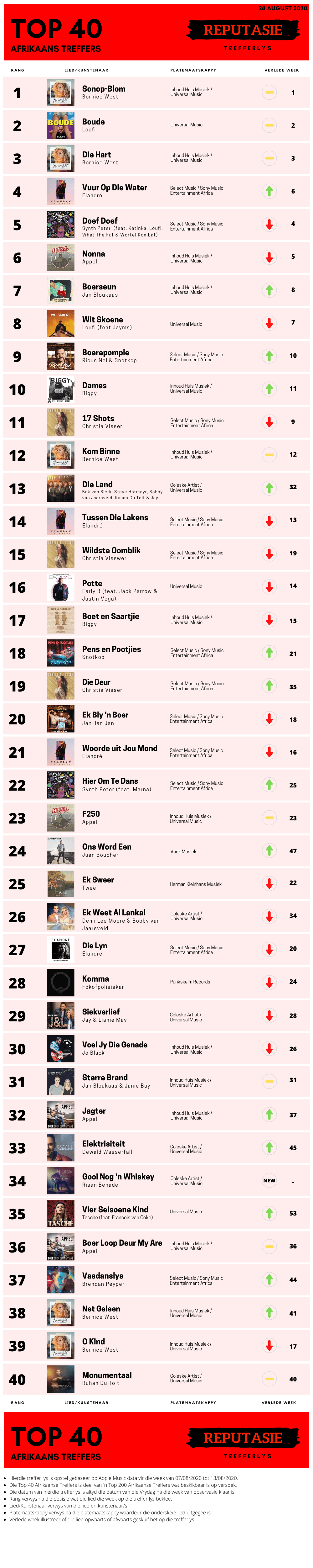 Hierdie week op die Reputasie Top 40 Afrikaanse Trefferlys – 28 Augustus 2020